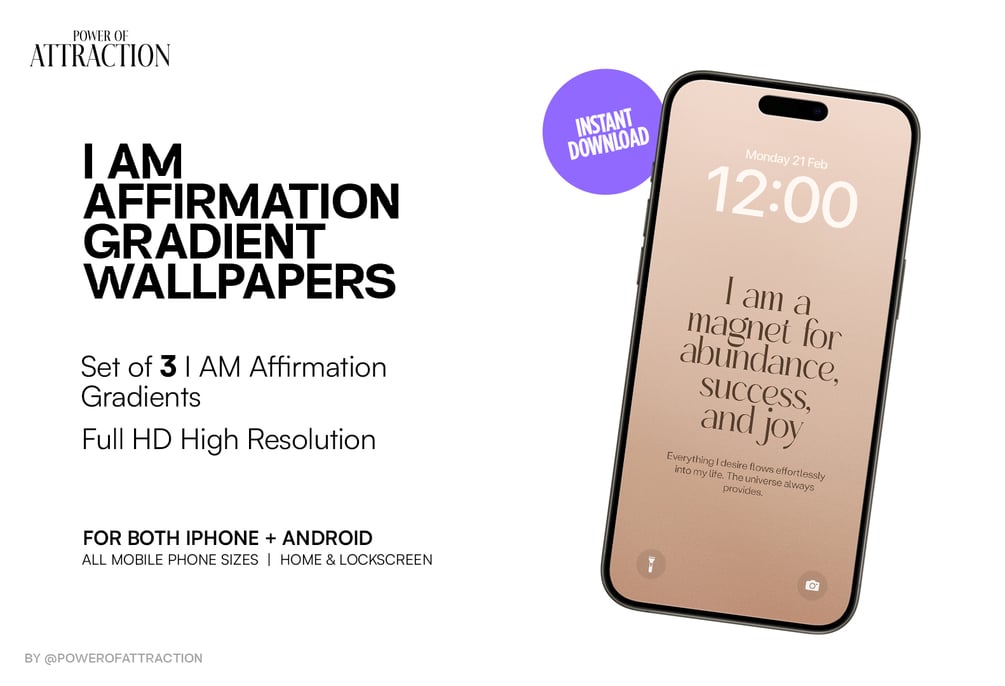 Empower yourself daily with this exclusive set of 3 high-resolution affirmation wallpapers designed to help you manifest abundance, success, love, and happiness. Each wallpaper features a powerful "I AM" affirmation set against a soothing gradient backdrop, perfect for aligning with your highest self.